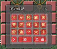 当本游戏室允许子力标记功能时,游戏开始之后,右键单击其他玩家的棋子,在右键位置处弹出小提示框,框中选项为:司、军、师、旅、团、营、连、排、兵、弹、雷、旗、?、大、小、>、清、全清,十八个小图标。